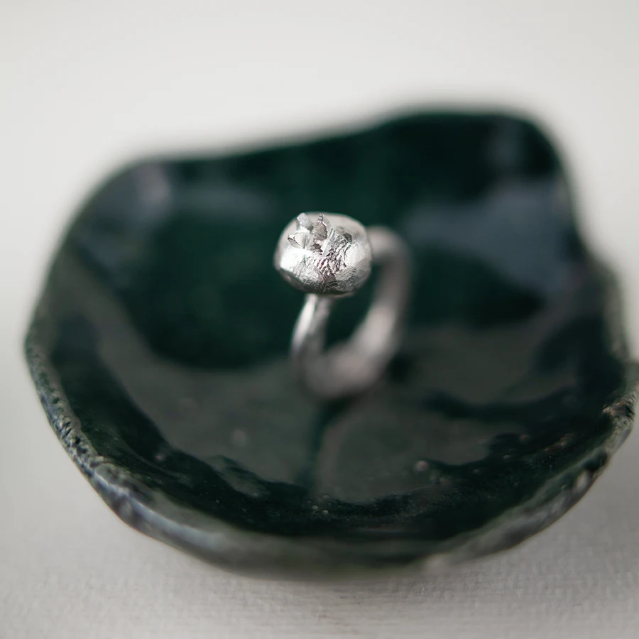 La melagrana nera è argento che, attraverso un trattamento di ossidazione, viene ricoperto da un patina scura. L’ossidazione, nonostante un processo di protezione, potrebbe col tempo affievolirsi. Si consiglia quindi, per preservare al meglio la finitura, di non indossare l’anello se si vogliono fare lavori manuali o entrare in contatto con agenti chimici (saponi, detergenti, sostanze acide, etc…)
