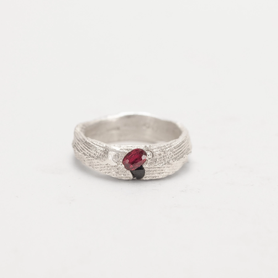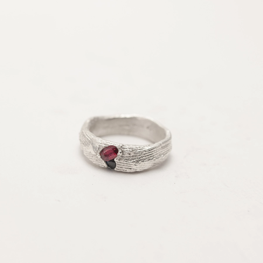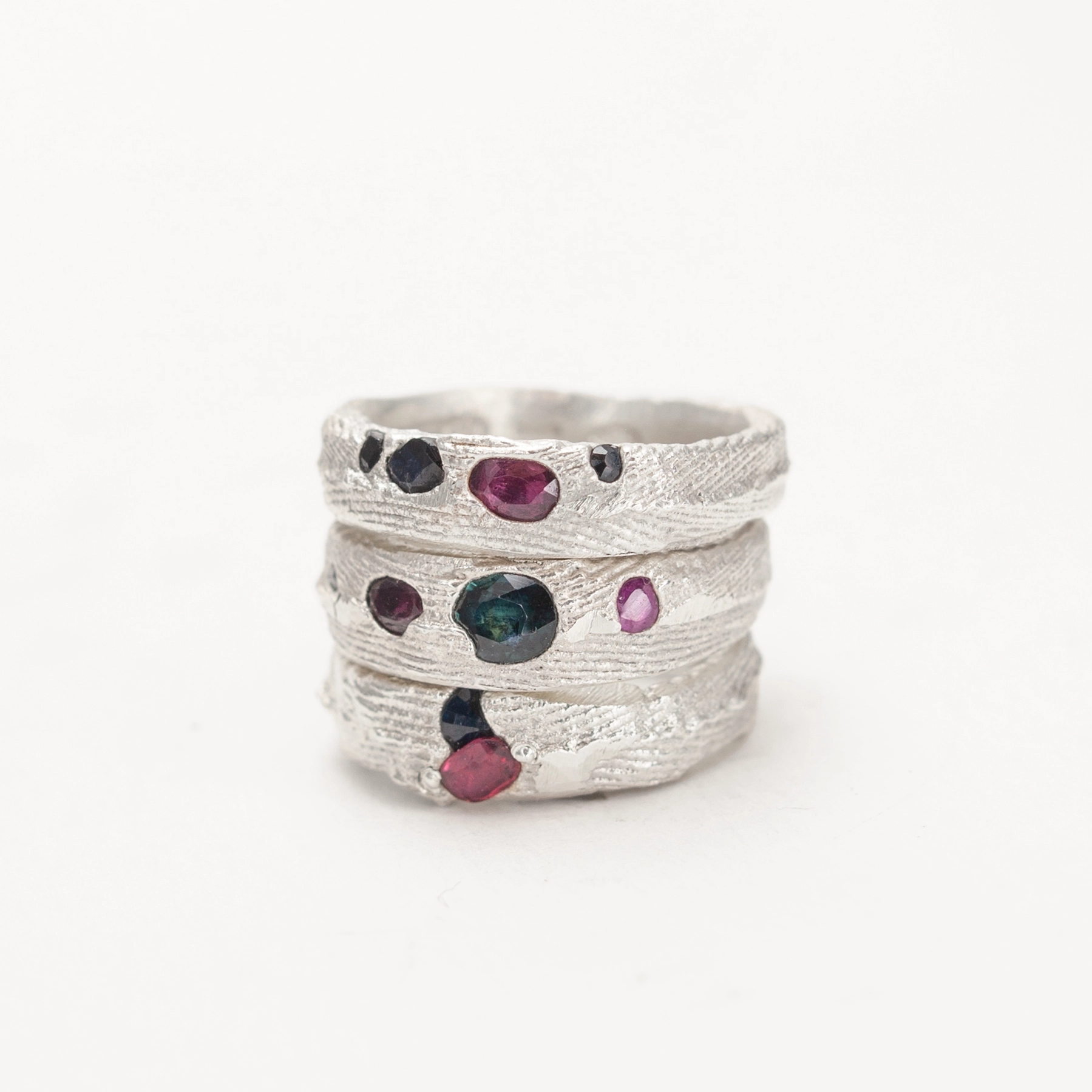 Con questa tecnica sperimentale, le pietre vengono posizionate direttamente nello stampo e poi colato il metallo fuso, in questo caso argento, diventando letteralmente un tutt’uno.