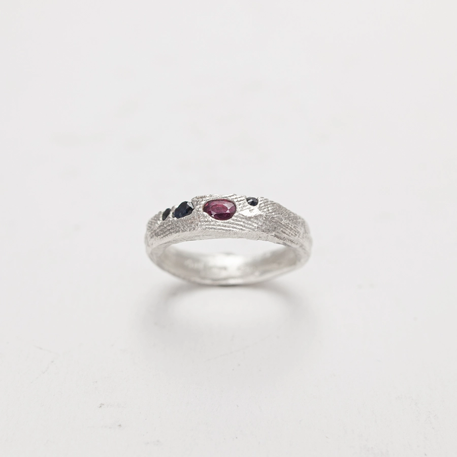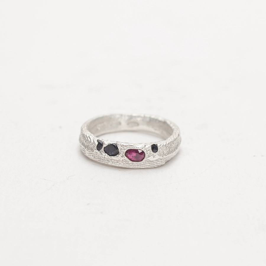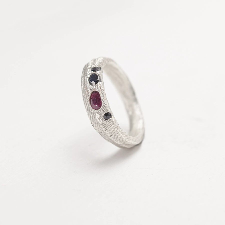 Elegante anello in argento unico nel suo genere con zaffiri colorati incastonati con la tecnica cast-in-place tramite fusione in osso di seppia.